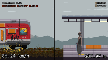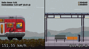 The goal is to make the train stop as close as possible to its target position at the station. The breaking behavior is influenced by weather (e.g. rain) and the total mass of the train, determined by the amount of passengers. Stopping the train or overshooting the station by a lot ends the level.